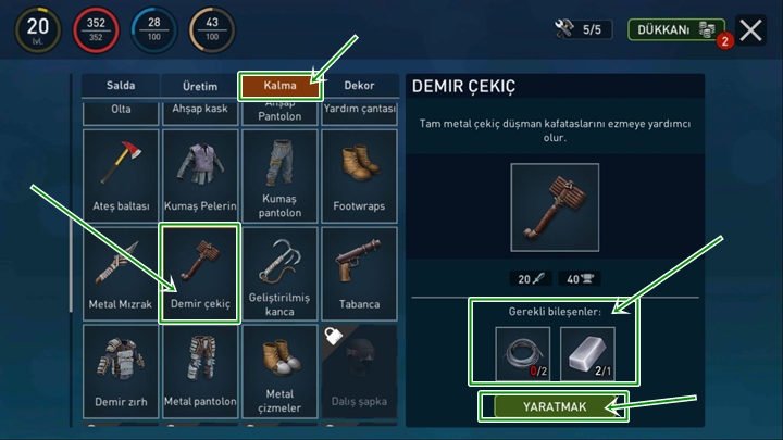 Ardından hayat kalmanıza yarayacak malzemelerin yer aldığı ‘kalma’ menüsüne tıklayın ardından demir çekici bulun ve bir kez tıklayın gerekli bileşenleri sağlıyorsanız yarat butonuna basın üretim ardından çantanıza eklenmiş olur.