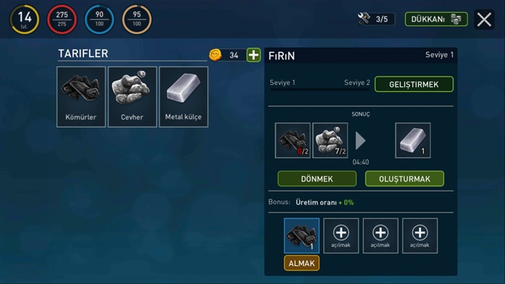 Fırında bir adet metal külçe yapabilmeniz için iki adet kömür ve iki adet cevher ihtiyacınız var. Metal cevher üretim süresi ise dört dakika kırk saniyedir.