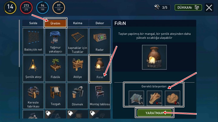 Soldan ikinci sırada yer alan ‘Üretim’ yazan menüye tıklayın. Ardından size bir liste görünecek buradan fırını bulun ve Mouse sol tuş ile tıklayın ekranınızın sağ tarafında fırın görünecek. Gerekli malzemeleri temin ettiyseniz beyaz renkte görünür malzemeler. Malzemelerin hemen altında yarat butonu olacak ona tekrar Mouse sol tuş ile tıklayın ve üretin. Üretim ardından size salınıza yönlendirecek salınızın istediğiniz herhangi bir yerine yerleştirebilirsiniz. Yerleştirme işlemi Mouse sol tuşuna bir kez basarsanız tamamlanır.