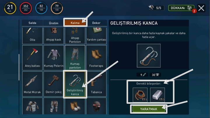 Ardından hayat kalmanıza yarayacak malzemelerin yer aldığı ‘kalma’ menüsüne tıklayın ardından gelişmiş kancayı bulun ve bir kez tıklayın gerekli bileşenleri sağlıyorsanız yarat butonuna basın üretim ardından çantanıza eklenmiş olur.