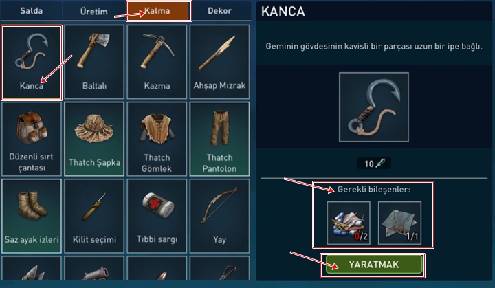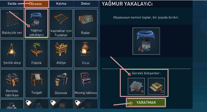 Ardından ekranınızın sağ alt köşesinde yer alan çekiç simgesine tıklayın ardından soldan ikinci sırada yer alan üretim menüsüne tıklayın ve yağmur yakalayıcı seçin ve sağ tarafta açılan menüde yaratmak butonuna tıklayın ve salınızda istediğiniz bir yere kurun.