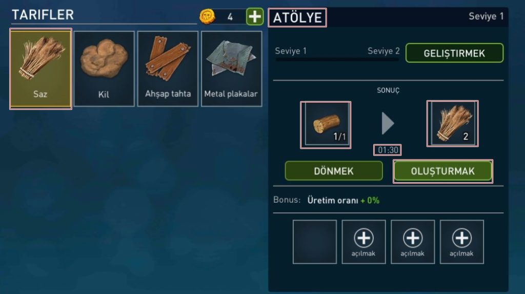 İlk olarak saz üretebilmeniz için kanca ile okyanustan odun toplamanız gerekmektedir.