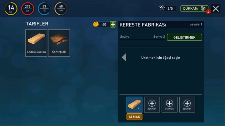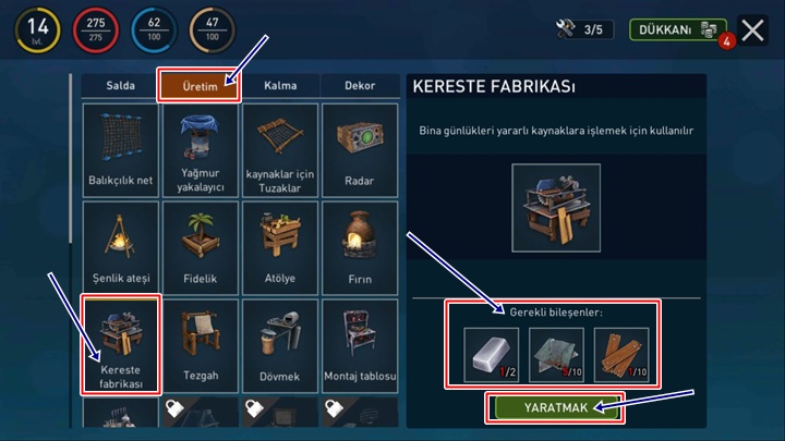 Ekran sağ tarafında kereste fabrikası görseli ve üretim için gerekli bileşenler ekranı gelecek tüm şartları yerine getirdiyseniz bileşenler ve gerekli malzeme sayı rengi beyaz olur ardından hemen altında yaratmak butonuna basabilirsiniz ve üretim yapılmış olur.