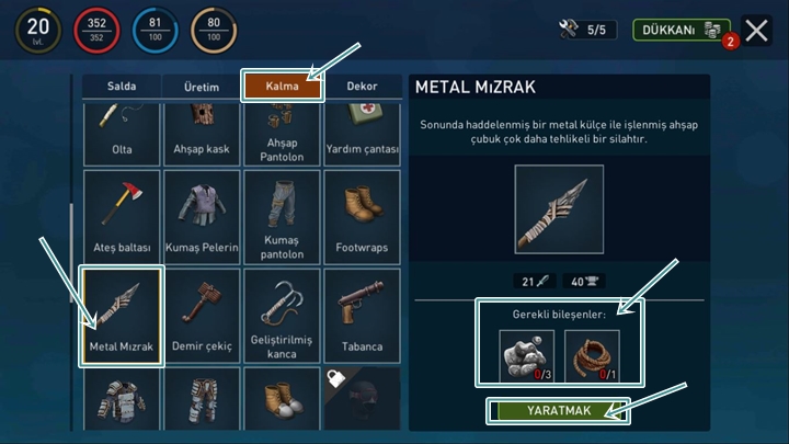 Ardından hayat kalmanıza yarayacak malzemelerin yer aldığı ‘kalma’ menüsüne tıklayın ardından metal mızrağı bulun ve Mouse sol tuş ile bir kez tıklayın gerekli bileşenleri sağlıyorsanız yarat butonuna basın üretim ardından çantanıza eklenmiş olur.