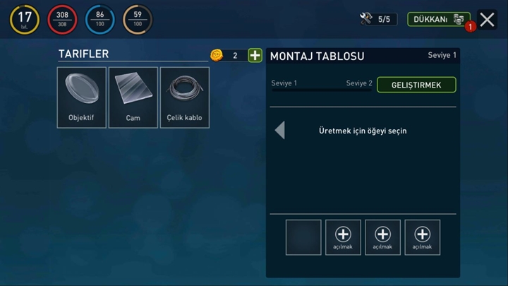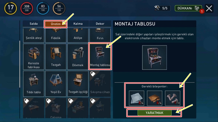 Ardından soldan ikinci sırada yer alan ‘üretim’ adlı menüye tıklayın. Bu menü sal üzerine yeni istasyonlar kurmanızı ve daha fazla malzemelere erişim sağlamanıza yarar. Bu şekilde hayatta kalacağınız zaman sürecini arttırmış olursunuz. Menüden montaj tablosunu bulun ve Mouse sol tuş ile bir kez tıklayın ardından ekranın sağ tarafından montaj tablosu belirecek gerekli bileşenleri karşılıyorsanız yarat butonuna basın ve üretimi tamamlayın. Üretim ardından sizi sal görünümüne yönlendirecek ve sal zemini üstünde istediğiniz herhangi bir alana yerleştirebilirsiniz.