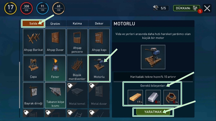 Açılan üretim menüsünde ‘salda’ yazan sal araç ve gereçleri üretmenizi sağlayan menüye tıklayın ardından sal motorunu bulun Mouse sol tuş ile bir kez tıklayın ardından ekranın sağ tarafından sal motoru belirecek gerekli bileşenleri karşılıyorsanız yarat butonuna basın ve üretimi tamamlayın. Üretim ardından sizi sal görünümüne yönlendirecek.