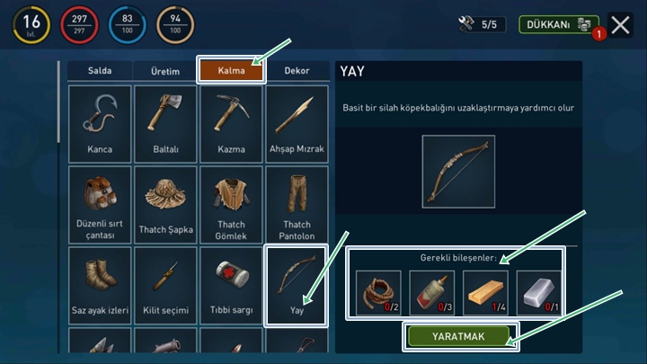 Daha sonra soldan üçüncü sırada yer alan ‘kalma’ adındaki hayatta kalmanızı sağlayacak malzemelerin yer aldığı üretim menüsüne tıklayınız ardından yayı bulun ve Mouse sol tuş ile bir kez tıklayın ardından ekranınızın sağ tarafında yay görseli ve üretim için gerekli malzemelerin olduğu bir ekran belirecek. Gerekli bileşenleri sağlıyorsanız malzemeler beyaz renkte olur ardından yarat butonuna basın yay çantanıza eklenmiş olacak.