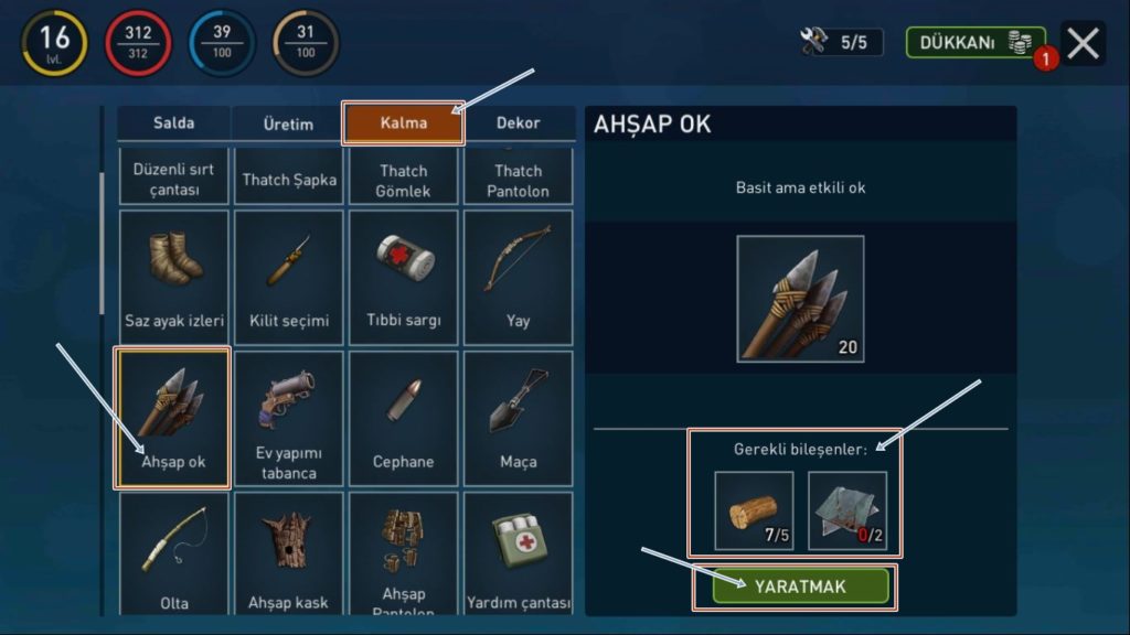 Daha sonra soldan üçüncü sırada yer alan ‘kalma’ adındaki menüye tıklayın ardından oku bulun ve Mouse sol tuş ile bir kez tıklayın ardından ekranınızın sağ tarafında ok görseli ve üretim için gerekli malzemelerin olduğu bir ekran belirecek gerekli bileşenleri sağlıyorsanız yarat butonunu tıklayarak üretimi yapabilirsiniz. Her bir üretim serisinden yirmi adet ok elde edersiniz.