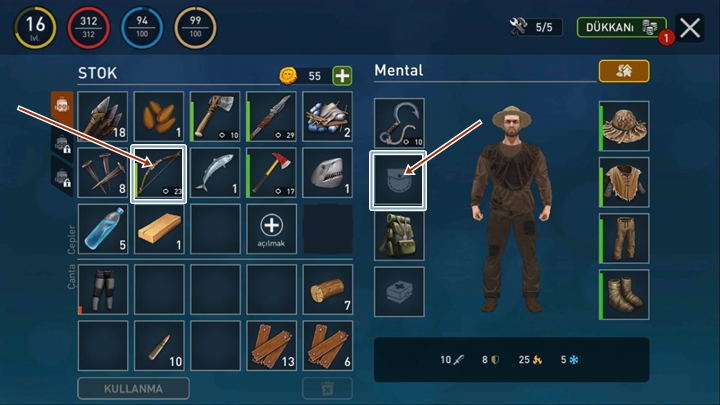 Çantanızı açın ekran sağ tarafında avatar ve avatarınızın kuşanabileceği bazı malzeme bölmeleri var bunlardan biriside silah bölmesidir. Üretmiş olduğunuz yayı Mouse sol tuş ile basılı tutarak silah bölmesine sürükleyin. Daha sonra çantanı bölümünüzü kapatın.
