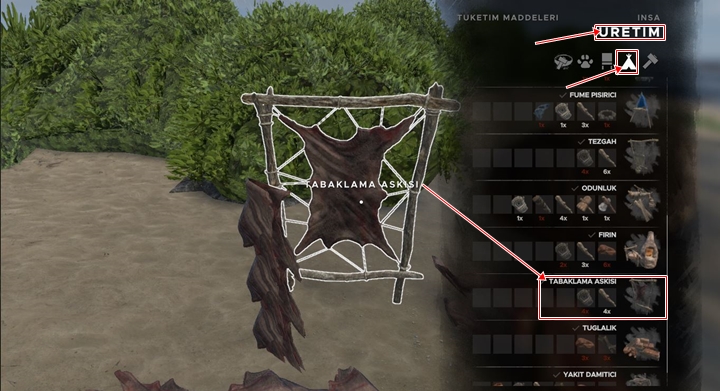 Tabaklama askısı yapımı için gerekli tüm malzemeleri çantanıza ekleyin daha sonra klavyenizden ‘C’ tuşuna basın üretim menüsünden sağdan ikinci simge olan yapılar simgesine tıklayın daha sonra tabaklama askısını bulun ve seçin ardından Mouse sol tuşu ile adanıza kurulum yapacağına ilerleyin ve kurun.