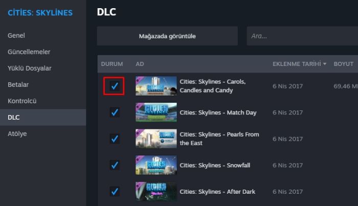 Açılan DLC bölümünden durum kısmının altındaki kutucuğu işaretlediğinizde o DLC aktif olacaktır. Aktif olan DLClerden kaldırmak istediklerinizin onay kutusundaki işarete tıklayarak kaldırabilirsiniz.
