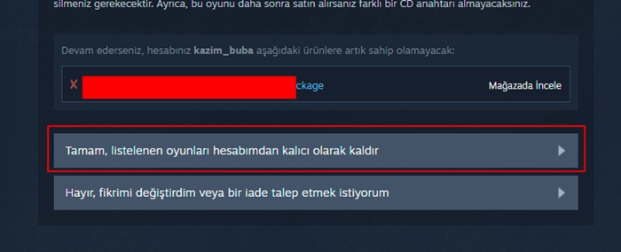Tamamen silmeden önce Steam son kez size fikrinizi değiştirmek için bir şans tanıyor. Burada eğer kararınızda eminseniz “Tamam, listelenen oyunları hesabımdan kalıcı olarak kaldır” butonuna basarak kütüphanenizden ve hesabınızdan kalıcı olarak kaldırabilirsiniz.