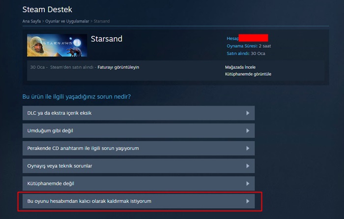 Detaylı görüntülediğinizde “Bu oyunu hesabımdan kalıcı olarak kaldırmak istiyorum” butonuna tıklayınız.