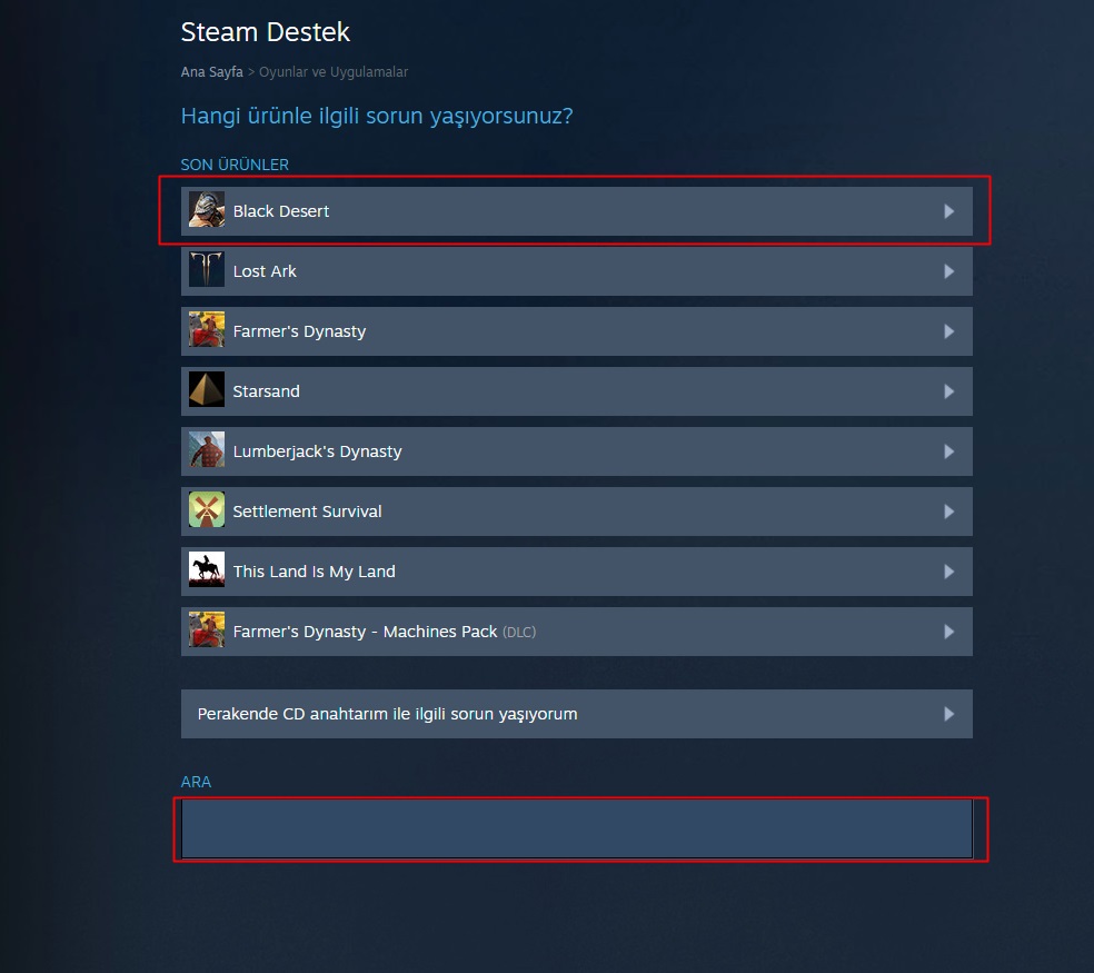 Kaldırmak istediğiniz oyun listenizde gözüküyorsa oradan başlığa tıklayarak ilerleyebilirsiniz. Eğer oyun listede gözükmüyorsa(son ürünler listesi) aşağıdaki arama kutusundan kaldırmak istediğiniz oyunun ismini yazmanız yeterlidir. Oyunun isminin olduğu alana tıklayın.