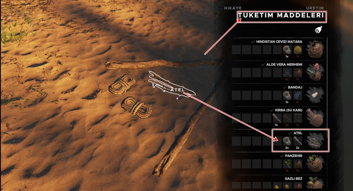 Tüm malzemeleri çantanıza ekleyin daha soran ‘E’ tuşuna basın ardından ‘Q’ tuşuna basın tüketim maddeleri menüsünden ateli seçin ve üretin üretimden sonra çantanıza otomatik olarak eklenmiş olacak.