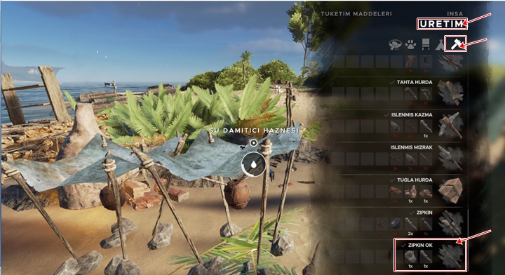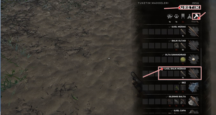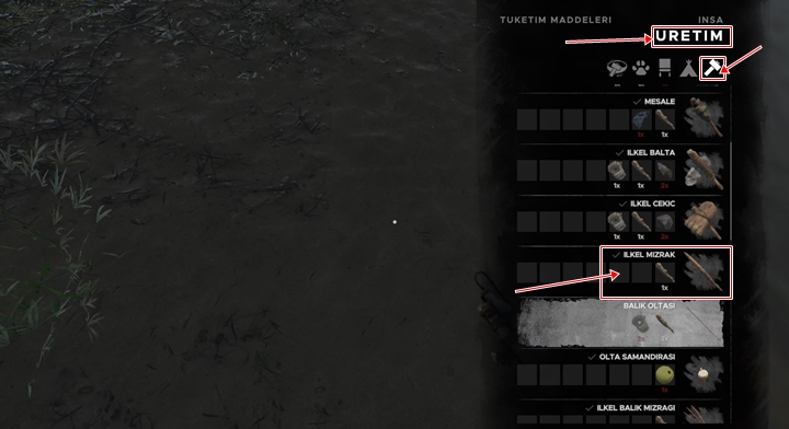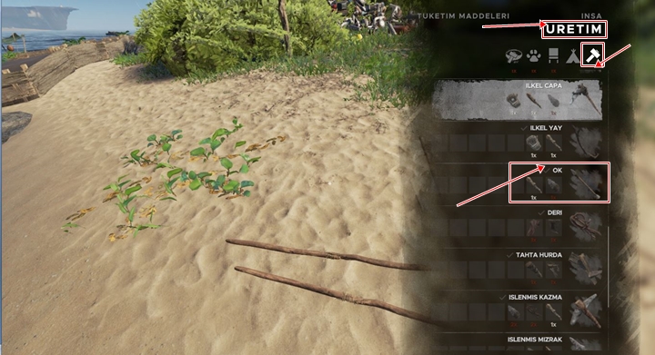 Tüm eşyalar çantanıza eklendikten sonra ‘C’ tuşuna basın üretim menüsü açılacak çekiç şeklinde olan simgeye tıklayın ardından ok üretmek için Mouse sol tuş ile tıklayın ve üretin üretim ardından çantanıza eklenir.