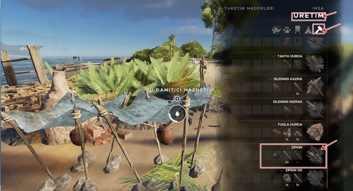 Palmiye ağacını kesin ve bir tane odunu çantanıza ekleyin. Palmiye fidanını veya yuka bitkisini bıçak yardımıyla kesin ardından yerdeki lifli yapraklara yönelin ve ‘C’ tuşuna basılı tutun ekranda açılır menüde halat göreceksiniz Mouse ile seçin ve üretin çantanıza eklenmiş olacak.
