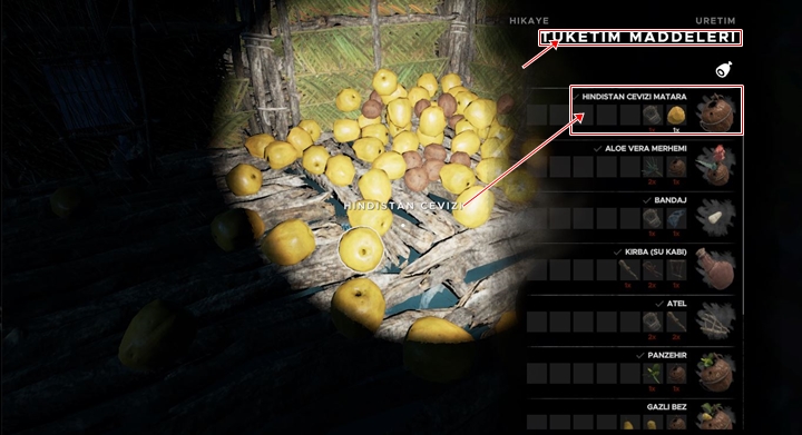 Tüm malzemeler çantanıza eklendikten sonra ‘E’ tuşuna basın ardından ‘Q’ tuşuna basın ve tüketilebilir maddeler menüsünü açın ilk sırada yer alan Hindistan cevizi mataraya tıklayın ve üretin.
