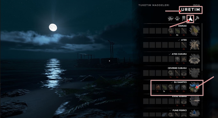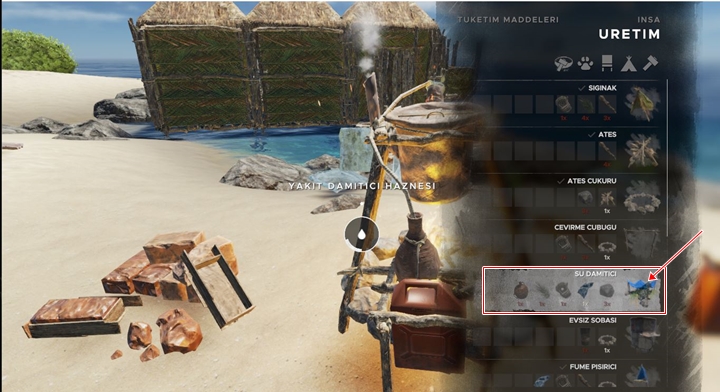 Tüm gerekli malzemeleri çantanıza ekleyin klavyenizden ‘C’ tuşuna basın ardından üretim menüsünden üçgen formatında çadıra benzeyen yapılar simgesine tıklayın daha sonra listeden su damıtıcıyı seçin ve yerleştireceğiniz zemine götürün ve Mouse sol tuşu ile kurun.