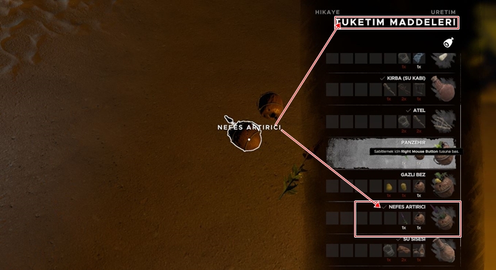 Tüm malzemeleri çantanıza ekleyin ardından ‘E’ tuşuna basın menü açılacak daha sonra ’Q’ tuşuna basın tüketim maddeleri menüsü açılacak nefes arttırıcıya tıklayın ve üretim tamamlanınca çantanıza otomatik eklenecektir.