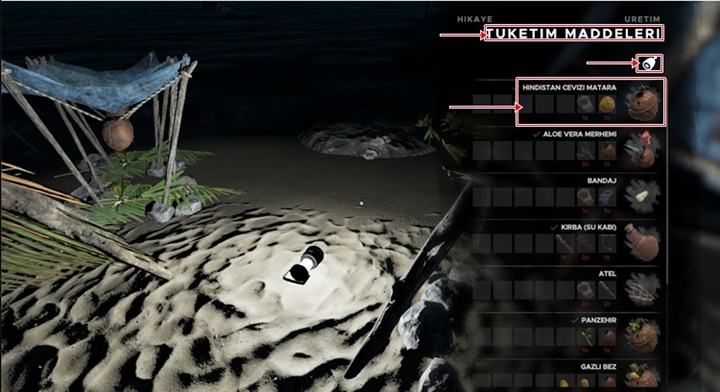 Matara yapımı ise Hindistan cevizini ve halatı envantere ekleyin daha sonra klavyeden ‘C’ tuşuna basın ardından ‘Q’ tuşuna basın ve Tüketim Maddeleri menüsü karşınıza gelecek daha ilk sırada yer alan Hindistan cevizi mataraya tıklayarak üretin.