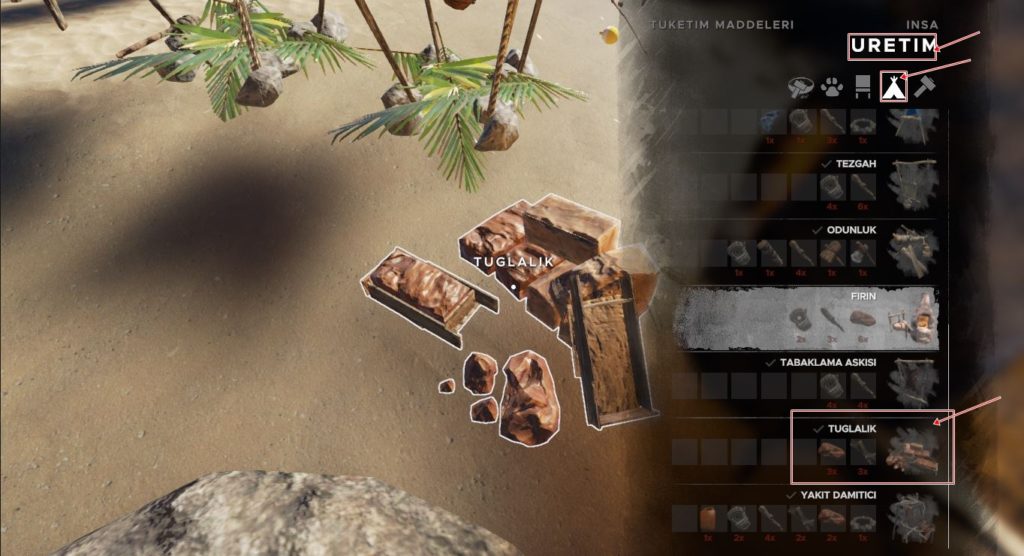 Üç tane tahta hurdayı ve üç tane kili çantanıza ekleyin ardından klavyenizden ‘C’ tuşuna basın üretim menüsü açılacak sağdan ikinci sırada yer alan küçük çadır şeklindeki simgeye tıklayın tuğlalık seçin ve üretin.