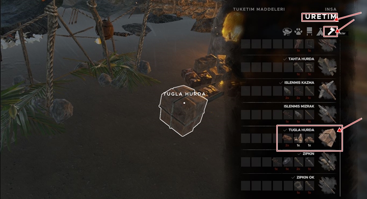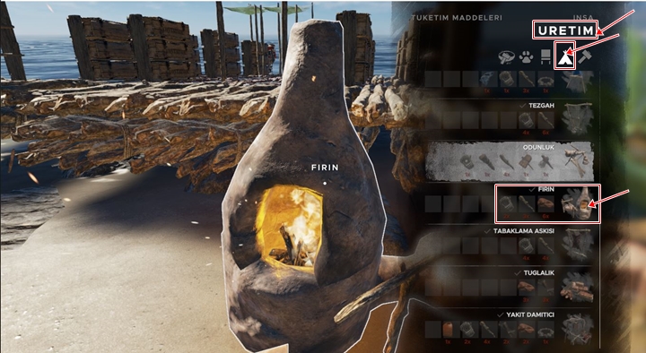 Tüm malzemeleri çantanıza ekleyin ardından klavyenizden ‘C’ tuşuna basın üretim menüsü açılacak sağdan ikinci sırada yer alan küçük çadır şeklindeki simgeye tıklayın fırın seçin ve üretin.