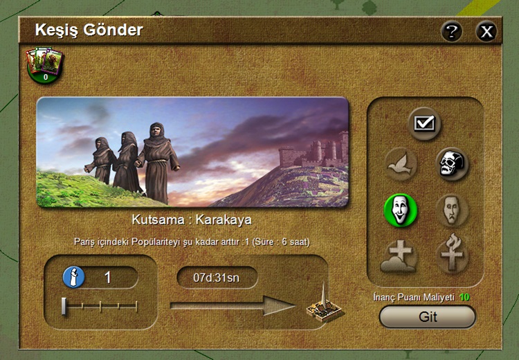 Keşişe sahip olduğumuz köyümüzden kutsamak istediğimiz parişi seçelim. Ardından kutsama özelliğini aktif ederek 10 inanç puanı karşılığında keşişimizi gönderelim.