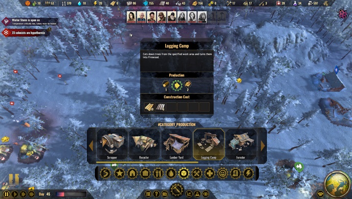 Bu bina, çevredeki ağaçları keserek yakacak odun haline getirir. 1 işçi ile günde 4 adet yakacak odun toplayan bu binaya ileride ikinci işçiyi vererek daha fazla yakacak odun üretebilirsiniz. Yine erken oyunda Burner isimli bina ile etrafında belirli bir alanı ısıtarak hipotermiden halkınızı koruyabilirsiniz.