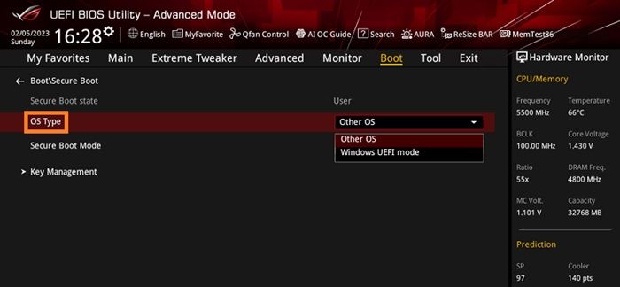 Os Type bölümünde Other OS ve Windows UEFI mode seçenekleri gözükecek. Other OS seçeneğini seçerseniz Secure Boot özelliği devre dışı kalacaktır. Windows UEFI mode seçeneğini seçerek Secure Boot kısmını açıyoruz.