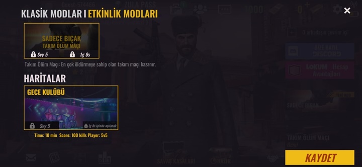 - Etkinlik Modları; Henüz 1 seçeneğe sahip olan bu moda ileride farklı etkinlik ve haritaların geleceği öngörülüyor. Sadece bıçak kullanılması hariç Pubg Mobilede ki ambar moduyla benzerlik gösteren bir moddur. 10 dakika sürede, 5v5 ekiplerle, 100 skor yapmayı amaçlayan bu moddaki mevcut harita, Sadece Bıçak seçimi ile Gece Kulübü haritasıdır.